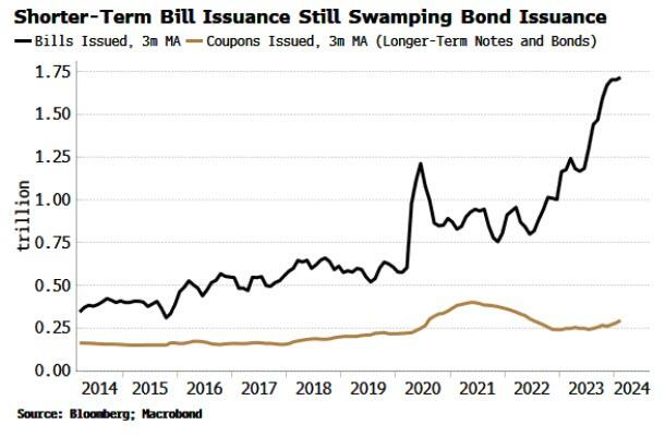 White bekijkt met name de kwartaalaankondiging van het ministerie van Financiën met betrekking tot de financieringsbehoeften van de overheid. Deze aankondiging laat een immense hoeveelheid aan benodigde dollars zien - $243 miljard in het tweede kwartaal en $847 miljard in het derde kwartaal. Slechts enkele jaren geleden waren dit soort bedragen ondenkbaar buiten een recessie om. De markt begint zich bewust te worden van de “Treasury put” en erkent dat het begrotingstekort waarschijnlijk niet snel zal terugkeren naar een niet-recessienorm. Termijnpremies stijgen omdat geldverstrekkers een hogere vergoeding eisen voor het aanhouden van langlopende schulden.