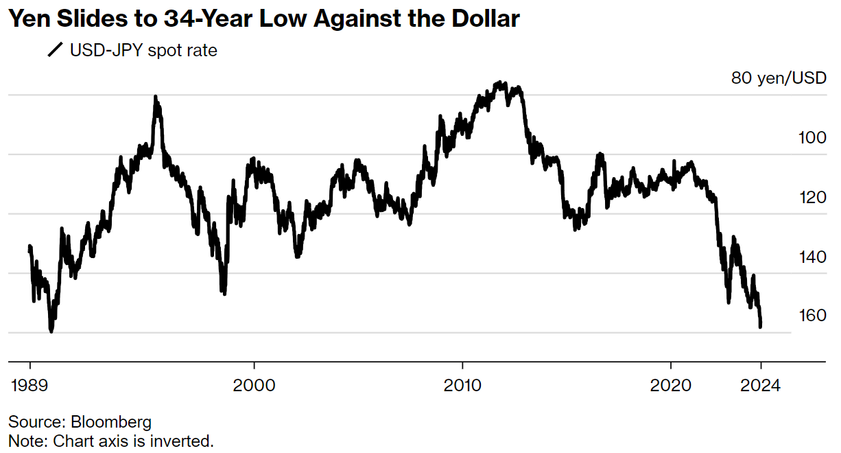 De Japanse yen zakte afgelopen vrijdag naar het laagste niveau sinds 1990, nadat de centrale bank besloot de rente niet verder te verhogen. Daardoor blijft het renteverschil met de Verenigde Staten en Europa groot, met als gevolg dat kapitaalstromen richting het Westen gaan.