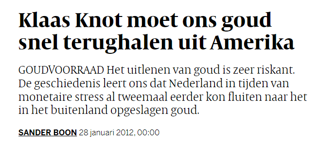 Eerder besloten Nederland, Duitsland en Oostenrijk al een deel van hun goudvoorraad terug te halen naar eigen land. De Nederlandsche Bank maakte dat in november 2014 bekend. Twee jaar eerder deed Sander Boon in een ingezonden stuk in de Volkskrant al een oproep aan Klaas Knot om de goudvoorraad weg te halen uit Amerika, vanwege de risico’s in tijden van stress in het financiële systeem.