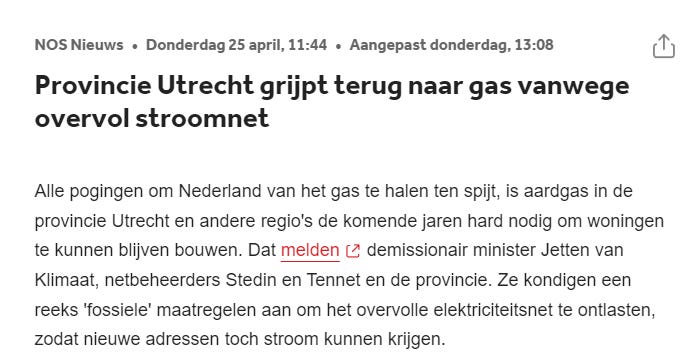 Het plan om Nederland stapsgewijs aardgasvrij te maken loopt al vast bij het aanleggen van woonwijken. Afgelopen week maakte de provincie Utrecht bekend dat het streven om meer woonwijken zonder aardgas te bouwen niet haalbaar is vanwege een overbelast energienet. Er is geen ruimte om nog meer warmtepompen en zonnepanelen aan te sluiten op het net, waardoor de plannen om meer woningen te bouwen vastlopen. Dat terwijl de stad Utrecht eerder nog de doelstelling had opgevat 40.000 woningen van het aardgas af te koppelen.